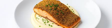 1. Salmón en costra de pistacho con puré de coliflor trufado