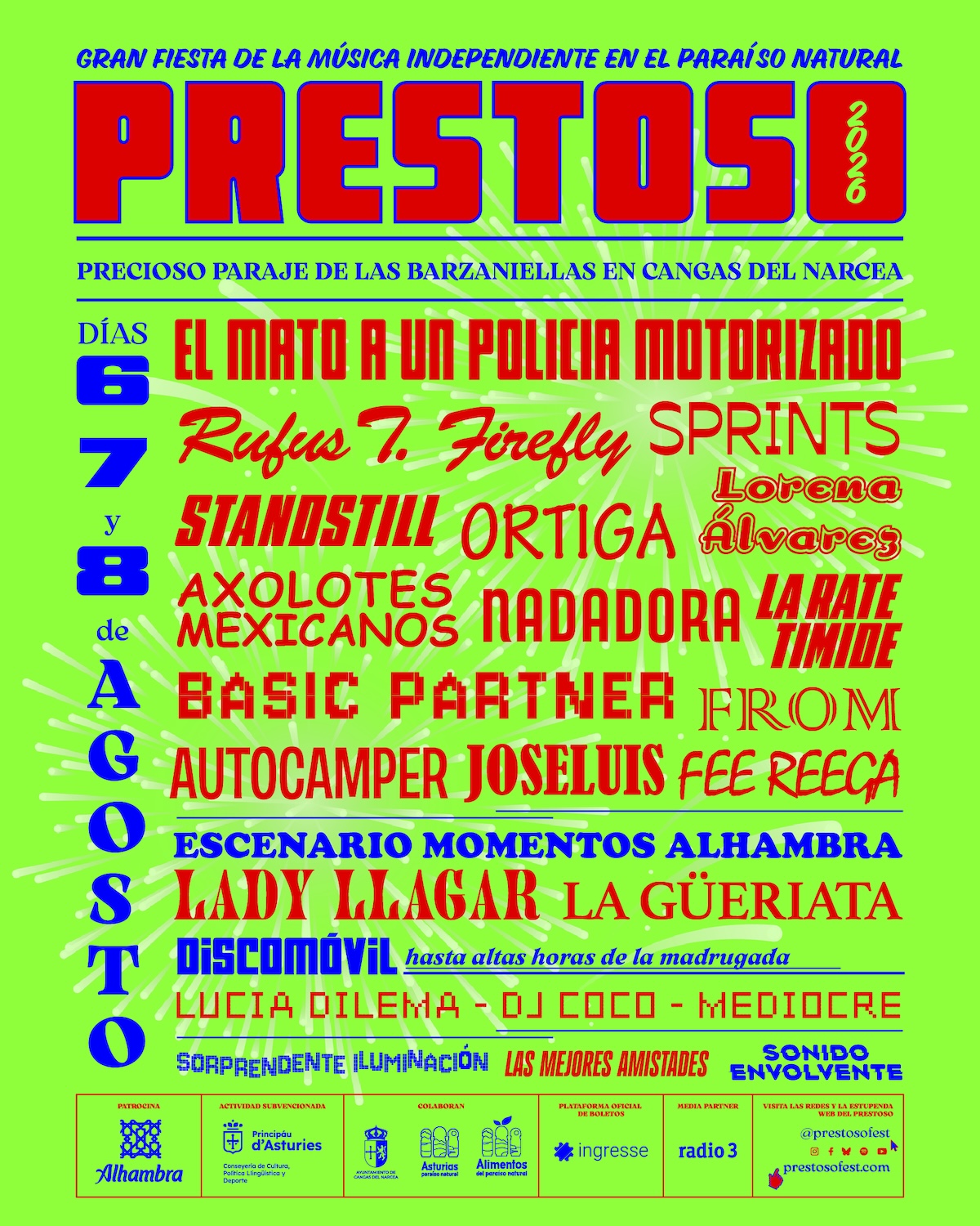 Vuelve el Prestoso Fest, uno de los festivales de música independiente más llamativos del norte de España. El festival, que volverá a celebrarse entre el 6 y el 8 de agosto en las Barzaniellas en Cangas del Narcea, acaba de anunciar su cartel al completo. Este año el evento contará con los directos de Él Mató A Un Policia Motorizado, Rufus T. Firefly, Sprints, Standstill (concierto especial 20 aniversario «Viva La Guerra»), Ortiga, Axolotes Mexicanos, Nadadora, Le Rate Timide, Basic Partner, Autocamper, Joseluis, From y más. Habrá también Discomóvil con pinchadas de Dj Coco, Lucía Dilema o Mediocre.
